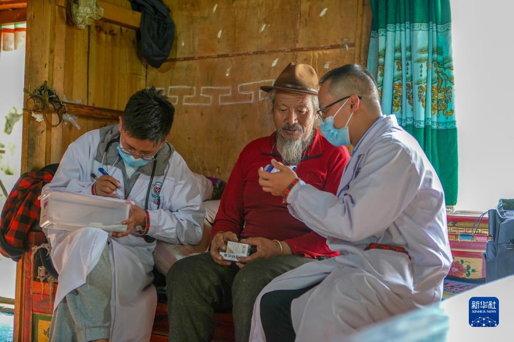 6月12日,王振疆(右)為吞不絨村89歲的村民娘姑進(jìn)行檢查。新華社記者 費(fèi)茂華 攝