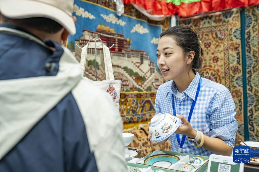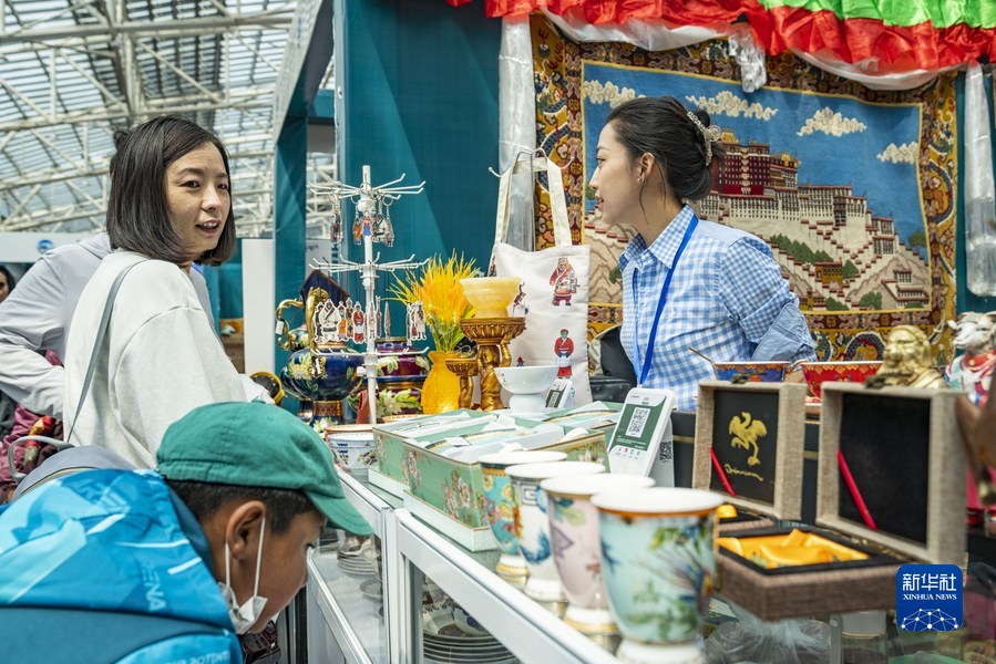 在第五屆“藏博會”現場,工作人員向顧客介紹產品(6月18日攝)。新華社記者 孫非 攝