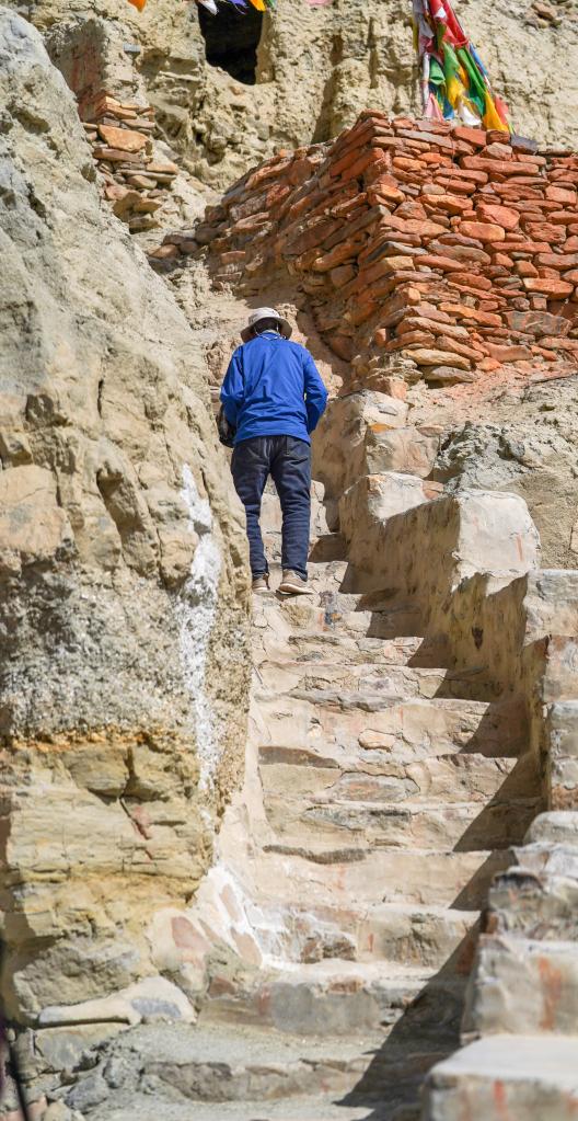 仁增旺扎老人的腿腳不便,每次從山腳登上石窟所在的山頂都需要耗費(fèi)巨大的氣力。皮央和東嘎石窟遺址群所在的小山相對(duì)高差大概有150米左右,一共有400多級(jí)臺(tái)階,每一級(jí)臺(tái)階都非常陡峭,走路一搖一晃的仁增旺扎老人每次都要花半個(gè)小時(shí)多才能從山腳登上山頂。
