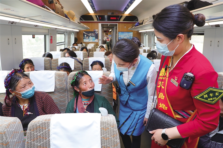 2022年初,青藏集團有限公司在管內(nèi)各站、車開展“天路格?;ā逼放苿?chuàng)建以來,拉林鐵路各車站、各次列車上都能看到“天路格桑花”服務隊員,他們用真誠、熱情、熱心為每一位旅客提供溫馨細致的服務。“6月初,我?guī)е⒆觼砦鞑芈糜危?月20日前往林芝,游玩了三天,由于家里有事,不得不趕回去,就買了今天中午回拉薩的火車票,剛開車不久我姑娘就發(fā)燒,肚子痛。列車員看見孩子難受就詢問情況,并找來列車長周晶,通過廣播為我們找醫(yī)生,還好沒啥大事,就是腸胃感冒,我也就放心了。周晶車長也一直在旁邊幫我照顧孩子,拿濕毛巾擦臉,蓋毛毯,送來熱水,太細心了,讓我很感動。她們工作認真負責,服務周到,我一路上都親身感受到了高原動車的熱情?!痹?4日林芝到拉薩的C926次列車上,來自四川的高雅女士拉著記者激動地說。