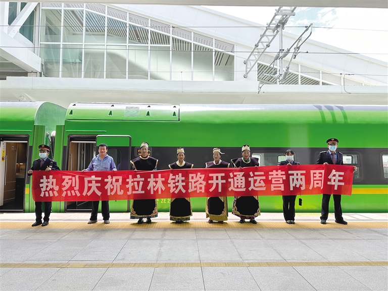 2021年6月25日,拉林鐵路開通運營,結束了藏東南不通鐵路的歷史,復興號動車開到西藏,駛上拉林鐵路,拉薩至山南、林芝最快1小時4分、3小時30分可達;山南至林芝最快2小時22分可達,相比汽車,從拉薩到林芝的時間幾乎節(jié)省了一半,從山南到林芝,也節(jié)省了2個多小時。兩年來,隨著運行方式逐漸成熟,鐵路方便、快捷的運輸優(yōu)勢逐步顯現(xiàn),客流持續(xù)攀升,青藏集團有限公司及時根據(jù)客流情況在周末、節(jié)假日、寒暑假等客流高峰期增開281趟臨時旅客列車。兩年來,拉林鐵路共運送旅客182.5萬人次,運輸貨物41.91萬噸,拉近了藏東南地區(qū)9個城市的距離,也深刻改變了當?shù)厝嗣竦墓ぷ骱蜕钣^念。