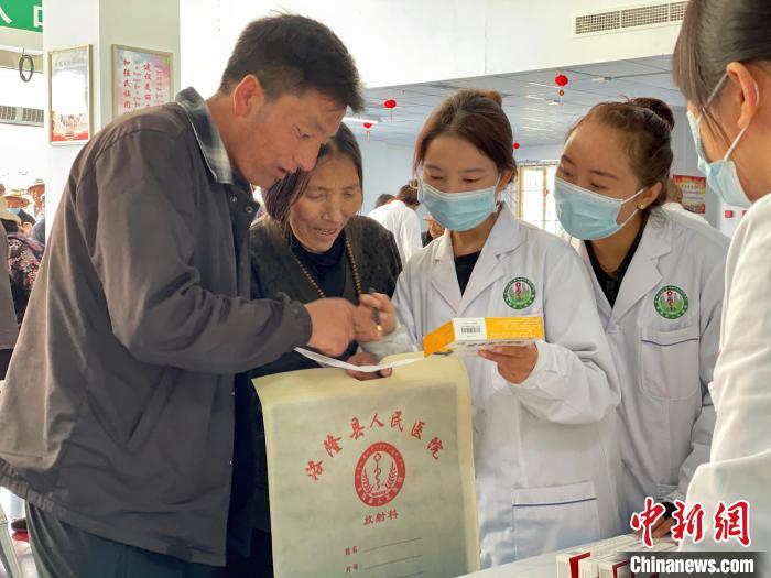 義診當(dāng)日,醫(yī)學(xué)專家分組在洛隆縣人民醫(yī)院和豐收廣場(chǎng)開(kāi)始義診。上午九時(shí)許,來(lái)自縣城周邊的藏族民眾在洛隆縣人民醫(yī)院(以下簡(jiǎn)稱“縣人民醫(yī)院”)門口早早排起了長(zhǎng)隊(duì),平日候診的醫(yī)院大廳早已布置成了臨時(shí)診室,醫(yī)務(wù)志愿者換上白大褂落座開(kāi)始義診??h人民醫(yī)院為每一位骨科、內(nèi)科、全科、呼吸科、婦科等科室的醫(yī)生配有一名藏族醫(yī)生,協(xié)助北京醫(yī)療專家與當(dāng)?shù)孛癖姕贤ú∏?,同時(shí)學(xué)習(xí)診療技術(shù)。