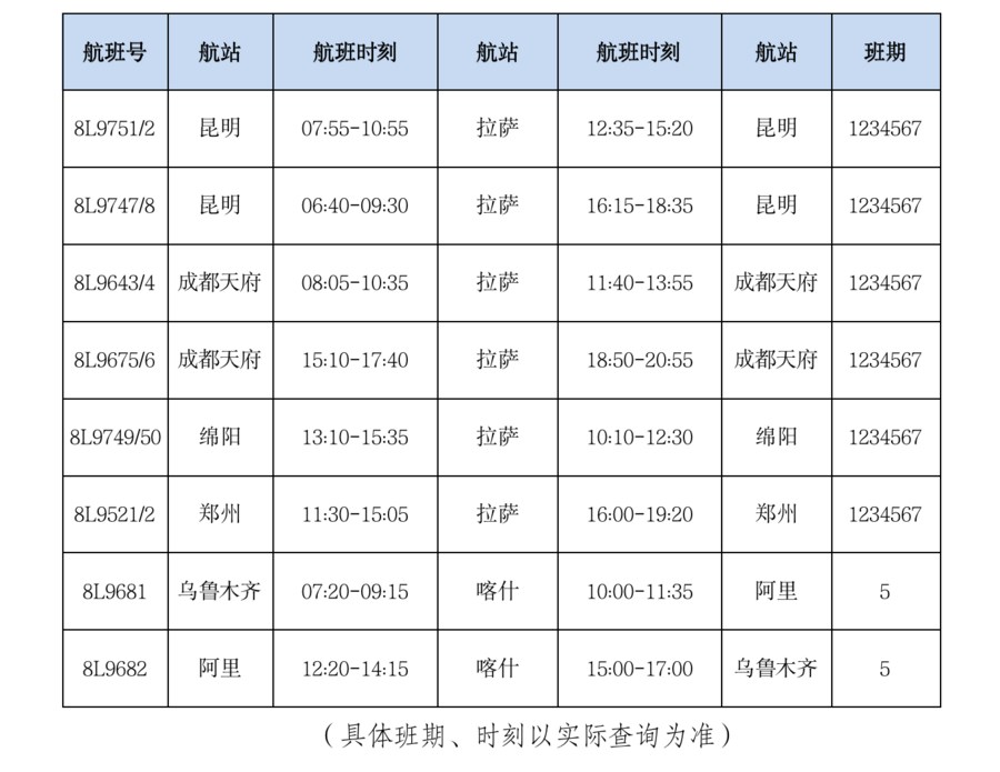 據(jù)了解,祥鵬航空“阿里—喀什—烏魯木齊”獨飛航線于6月23日復(fù)航,每周五執(zhí)飛一班;“拉薩—成都天府”航線于7月1日起升級為空客A330寬體機執(zhí)飛。