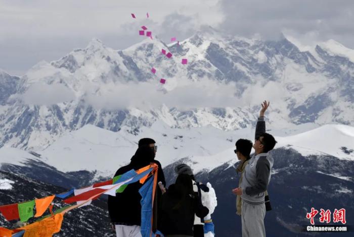 游客在西藏林芝色季拉山觀景臺(tái)拋灑“隆達(dá)”(風(fēng)馬旗,藏族民眾的一種祈福方式)。李林 攝