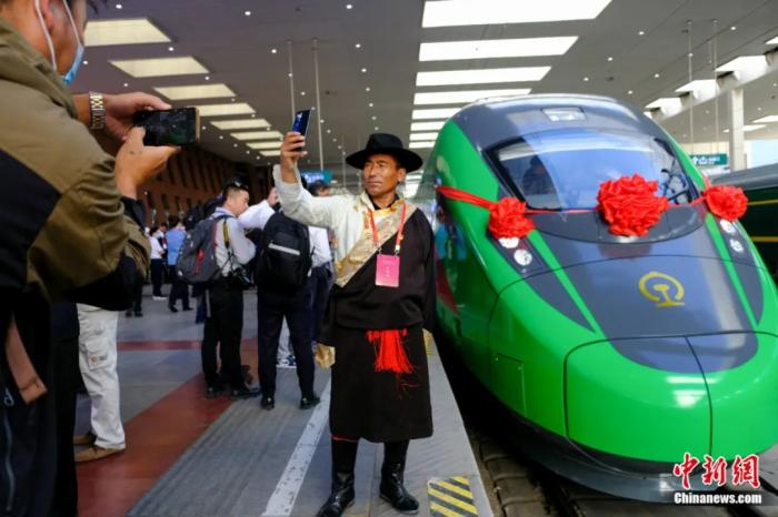 2021年6月25日,川藏鐵路拉林段(拉林鐵路)正式開通運(yùn)營(yíng)。民眾在拉薩火車站復(fù)興號(hào)車頭前自拍留念。江飛波 攝