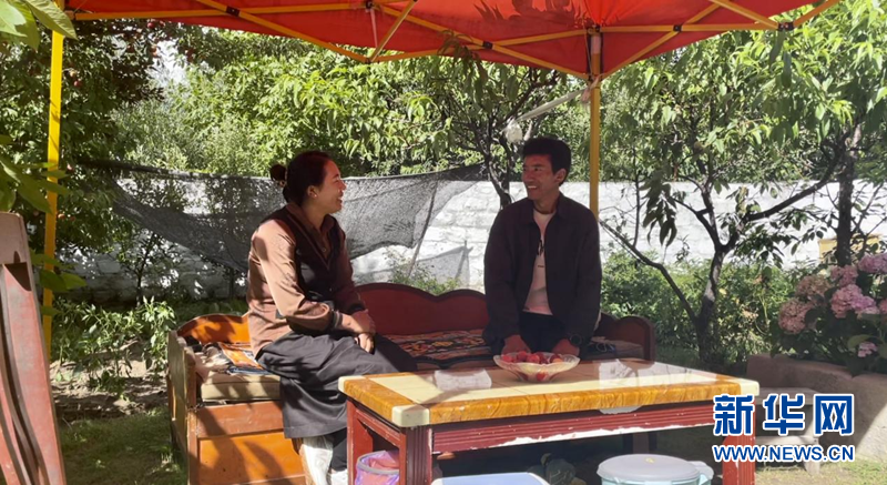 圖為嘎拉村村民達瓦參堅和妻子在自家的院子里聊天,身后是小菜園和不同的果樹。新華網(wǎng) 陳穎 攝
