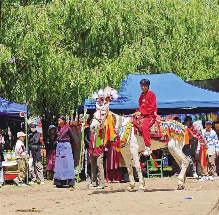 賽場上,幾個(gè)稚嫩的小伙子引起了大家的注意。他們熟練地跳上馬背、抓緊韁繩、目光堅(jiān)定?!巴?!太棒了!”“媽媽,那個(gè)哥哥拿到了哈達(dá)!”……只見16歲的單增阿旺策馬奔騰,俯身拾起地上的綠色哈達(dá),獲得大家的陣陣掌聲?!拔覐男【秃芟矚g騎馬,除了去年因?yàn)閷W(xué)業(yè)緊張,沒能參加賽馬表演,往常每年都會(huì)參加?!眴卧霭⑼f。