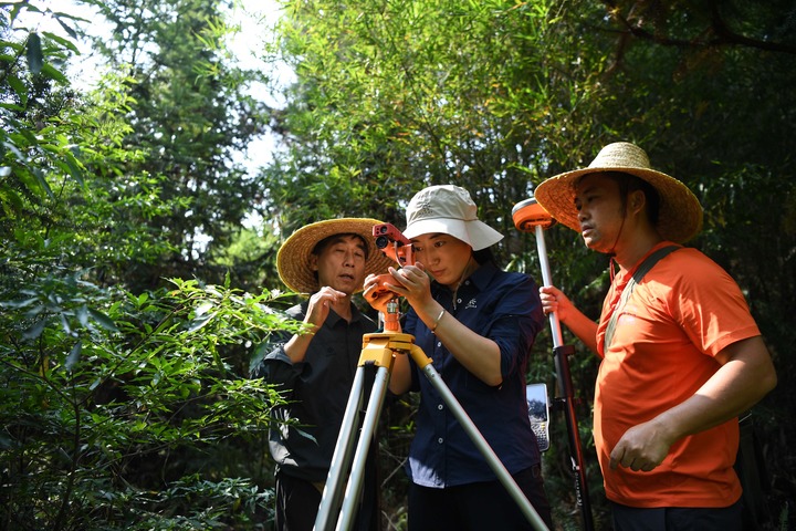 2022年9月22日,在廣東韶關樂昌市張溪村的生態(tài)監(jiān)測樣地,白拉曲珍(中)和師傅江建發(fā)(左)、同事伍國清(右)在操作設備。新華社記者鄧華 攝