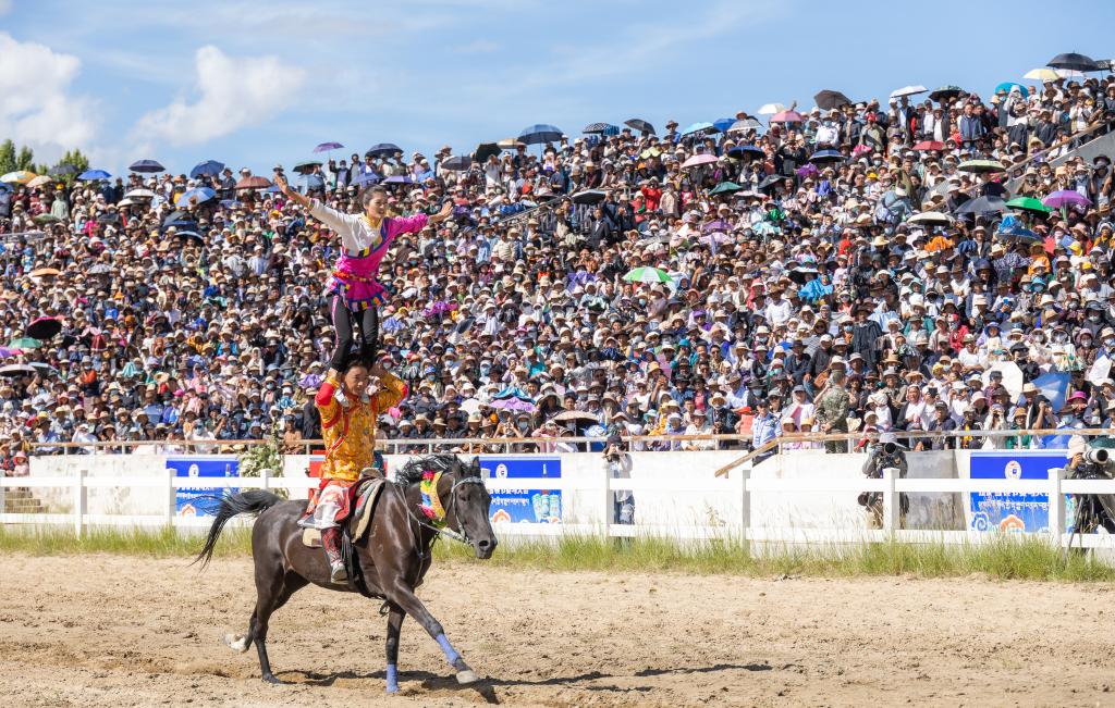 8月17日,2023拉薩雪頓節(jié)賽馬大會現(xiàn)場,兩位騎手正在進行單馬雙人表演。新華社記者 丁增尼達 攝