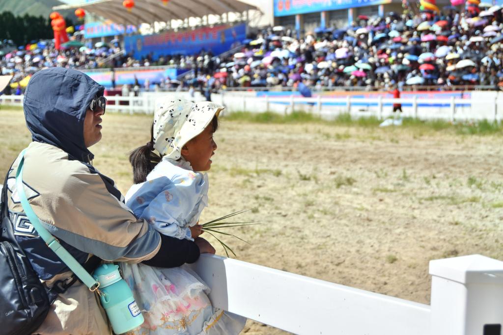 8月17日,2023拉薩雪頓節(jié)賽馬大會現(xiàn)場,一位父親帶著女兒來看比賽。新華社記者 劉文博 攝