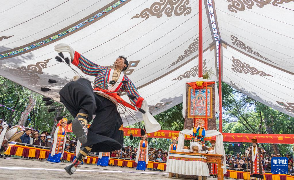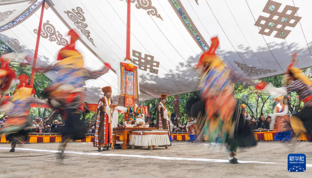 8月19日,在拉薩市羅布林卡園林內(nèi),貢嘎縣乃薩藏戲隊(duì)在為觀眾表演藏戲《朗薩雯崩》。新華社發(fā)(丁增尼達(dá)攝)