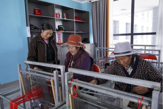 圖為綜合實訓(xùn)樓內(nèi),曲增(左)在教當(dāng)?shù)剞r(nóng)牧民制作藏式腰帶