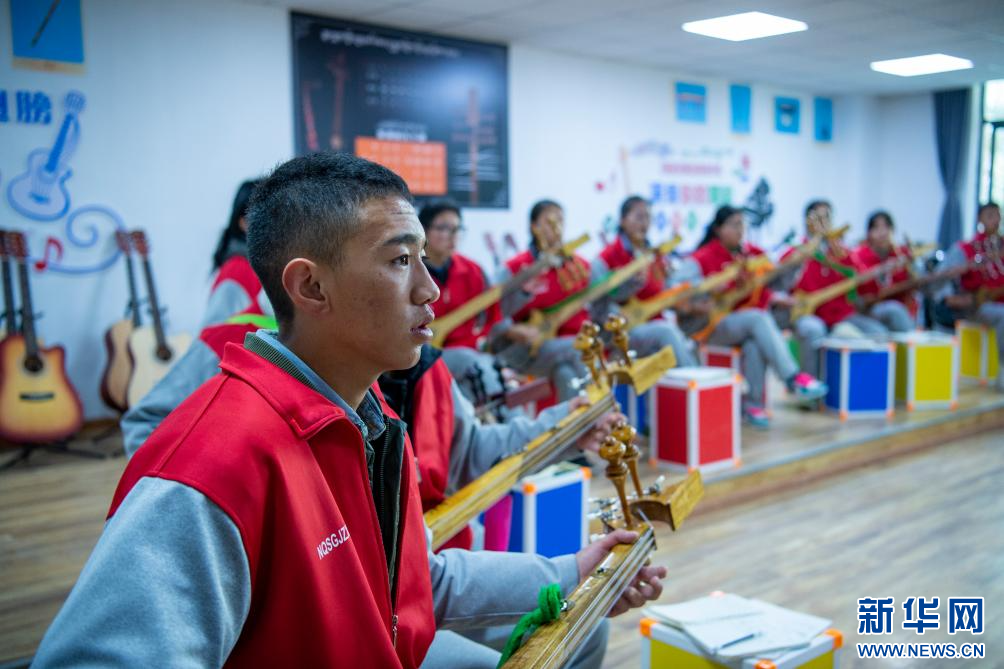 圖為那曲市高級中學(xué)學(xué)生在彈奏扎念琴(9月5日攝)。新華網(wǎng) 旦增努布 攝