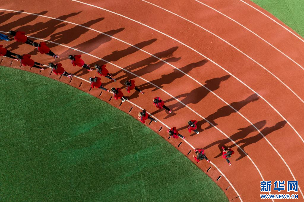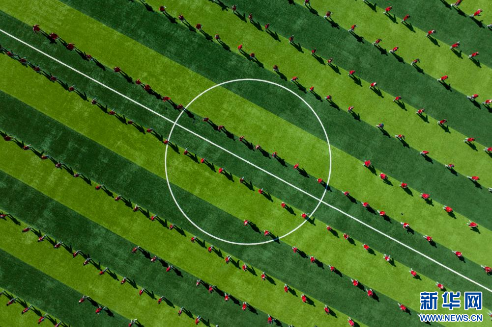 圖為那曲市第三小學(xué)學(xué)生在做體能訓(xùn)練(9月5日攝,無人機照片)。新華網(wǎng) 旦增努布 攝