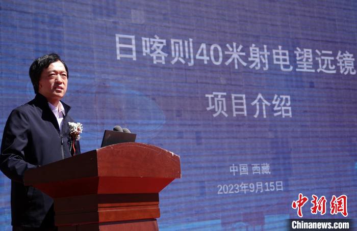9月15日,中國科學(xué)院上海天文臺臺長沈志強(qiáng)在日喀則40米射電望遠(yuǎn)鏡項(xiàng)目啟動會上,介紹該項(xiàng)目相關(guān)情況。中新網(wǎng)記者 孫自法 攝