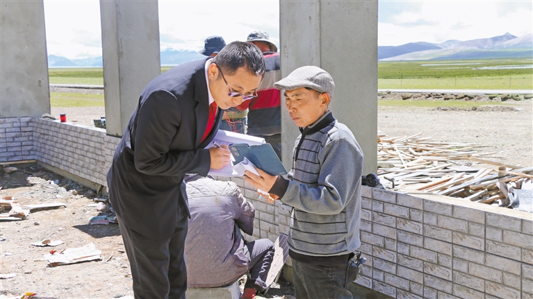 普瑪江塘中心法庭負責人巴桑次仁(左)正在向務(wù)工人員了解相關(guān)情況。