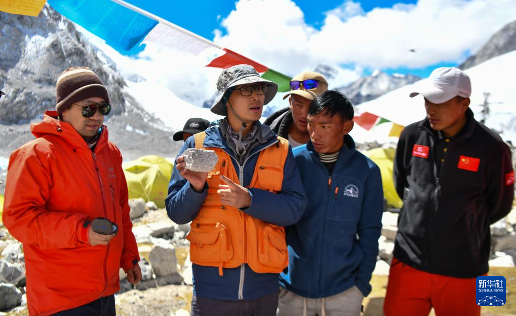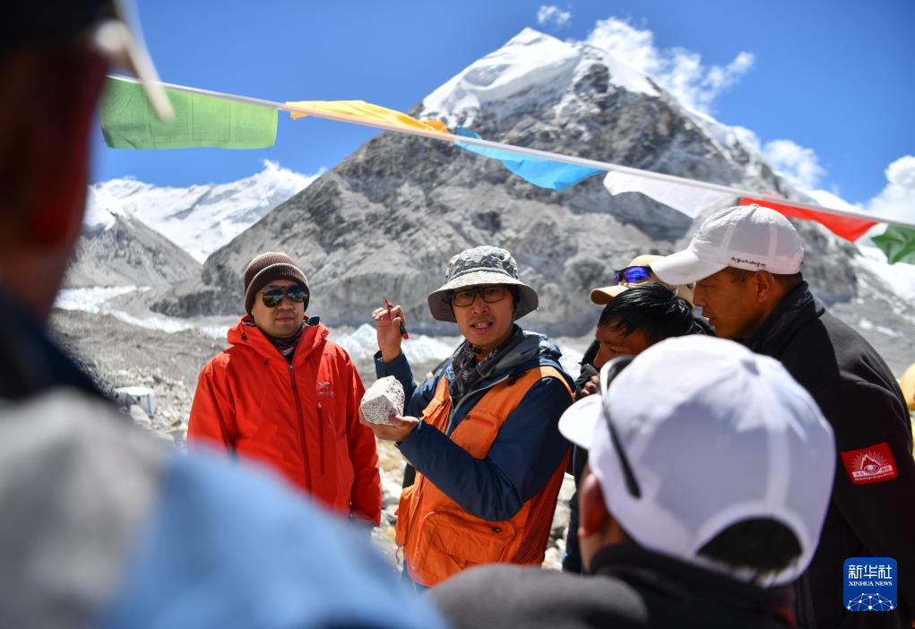 科考隊隊員褚楊(左三)在為西藏登山隊隊員講解如何采集峰頂至前進營地的巖石樣本(9月27日攝)。新華社記者 晉美多吉 攝