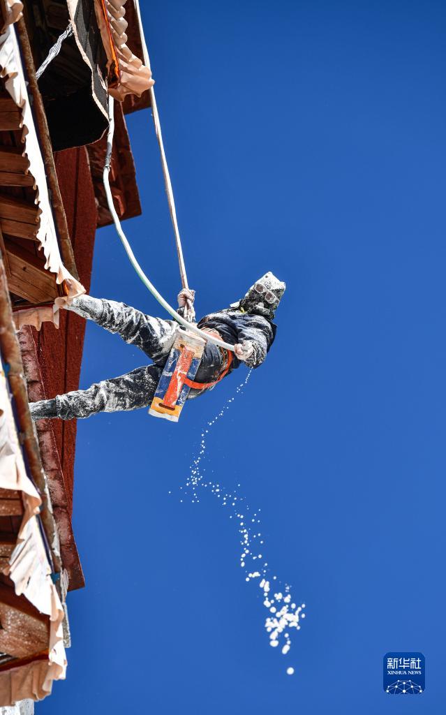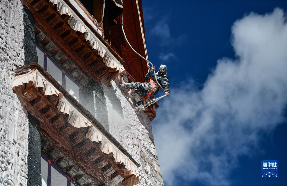 工作人員對布達(dá)拉宮外墻噴灑涂料(10月18日攝)。新華社記者 晉美多吉 攝