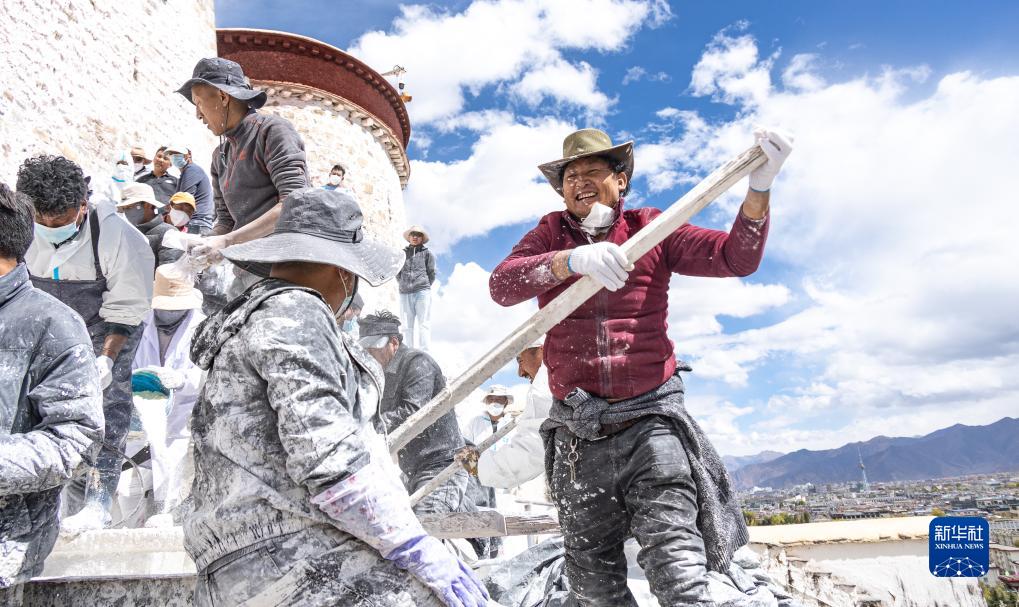 近日,西藏布達(dá)拉宮開始進(jìn)行粉刷維護(hù)工作。為使經(jīng)過一年日曬雨淋的紅墻白壁保持鮮亮光彩,每年秋冬交替時(shí)節(jié),布達(dá)拉宮外墻都要進(jìn)行粉刷“美容”。