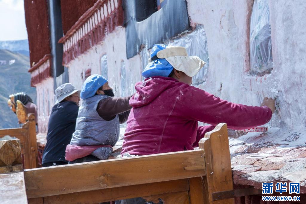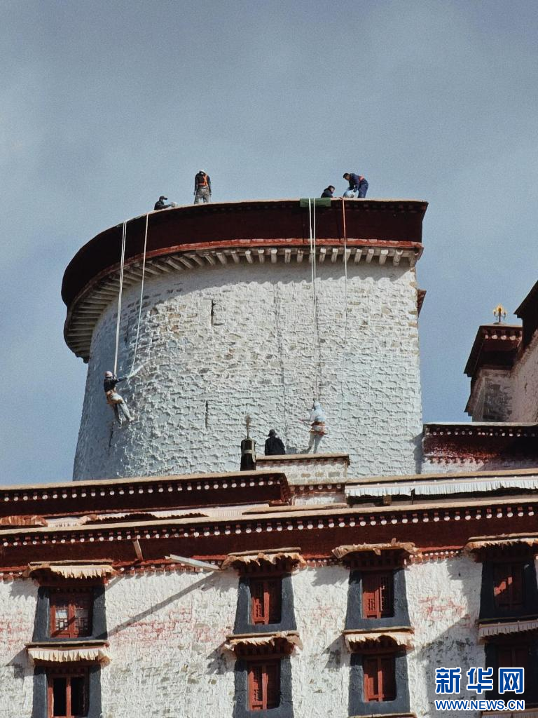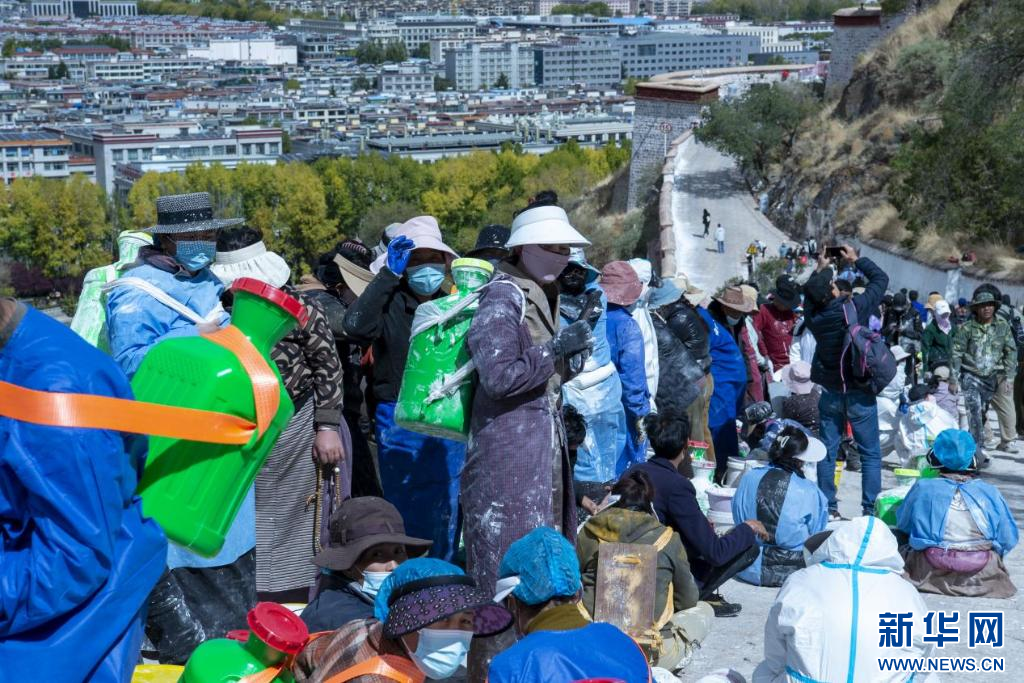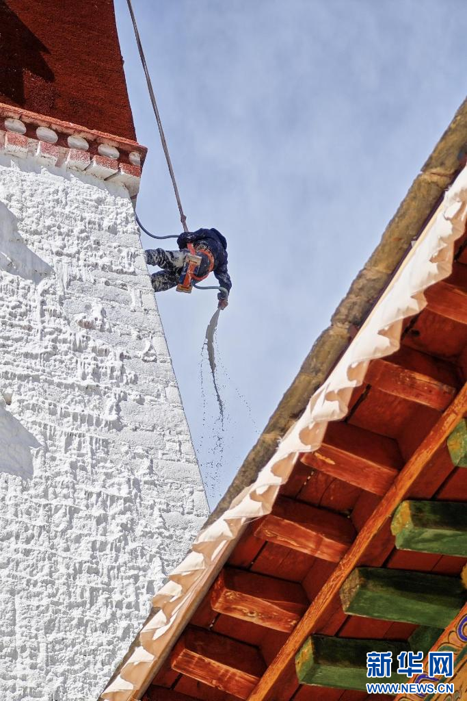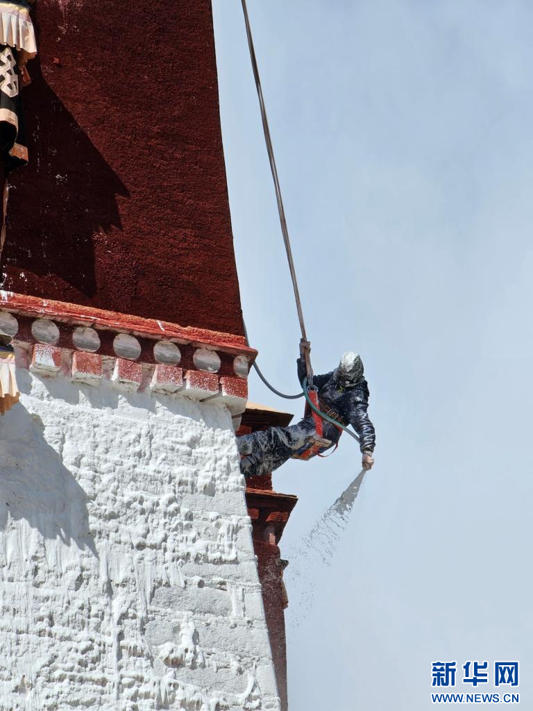 10月18日,布達(dá)拉宮“美容師”們在噴灑外墻。新華網(wǎng) 柑丹鴦琦 攝