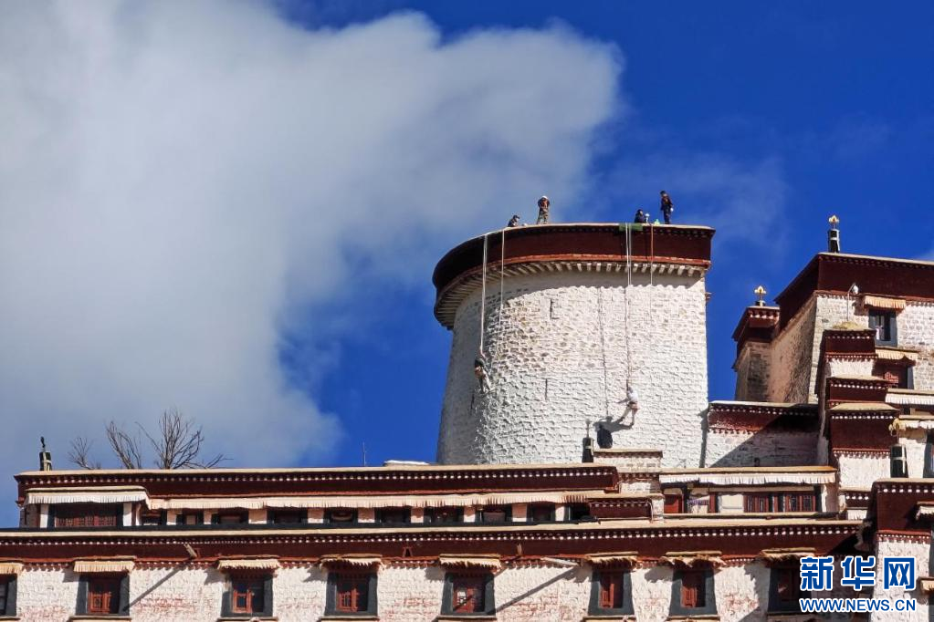 10月18日,布達(dá)拉宮“美容師”在噴灑涂料。新華網(wǎng) 柑丹鴦琦 攝