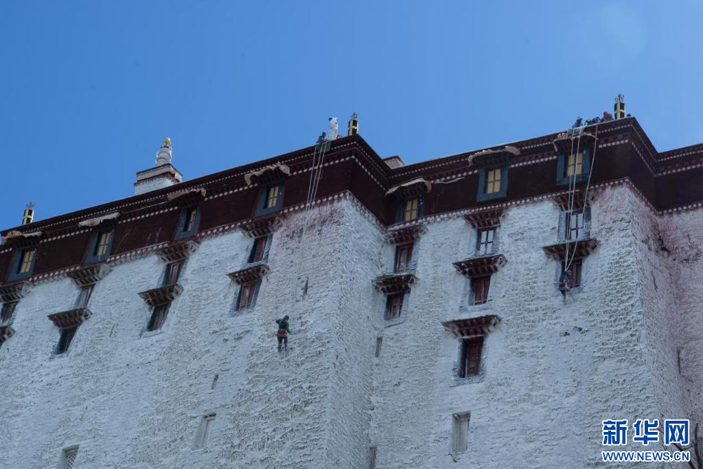 10月18日開始,布達(dá)拉宮進(jìn)入了一年一度的“粉刷季”,數(shù)百名群眾自發(fā)來到布達(dá)拉宮參與到“美容”工作中。這些“美容師”們腰間系著長繩,像“蜘蛛人”一樣將自己懸在半空,用人工噴灑的方式涂裝布達(dá)拉宮的外墻。