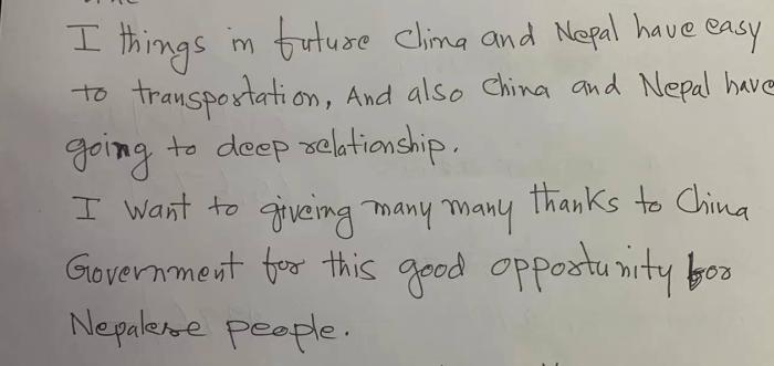 國(guó)之交在于民相親,民相親在于心相通。采訪過(guò)后,這位老人認(rèn)認(rèn)真真地用英文寫(xiě)下一封信并交給中新網(wǎng)記者。他說(shuō):“我相信,未來(lái)中尼交通將更加便利,兩國(guó)情誼將更加深厚。我非常、非常地感謝中國(guó)政府,為尼泊爾人民帶來(lái)了這些大好機(jī)會(huì)?!?/p>