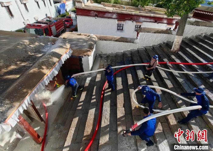布達(dá)拉宮墻體粉刷正式開始前一周,大隊(duì)每日清晨、傍晚組織指戰(zhàn)員對(duì)布達(dá)拉宮山體進(jìn)行全面濕化,消除火災(zāi)隱患。劉瑜 攝