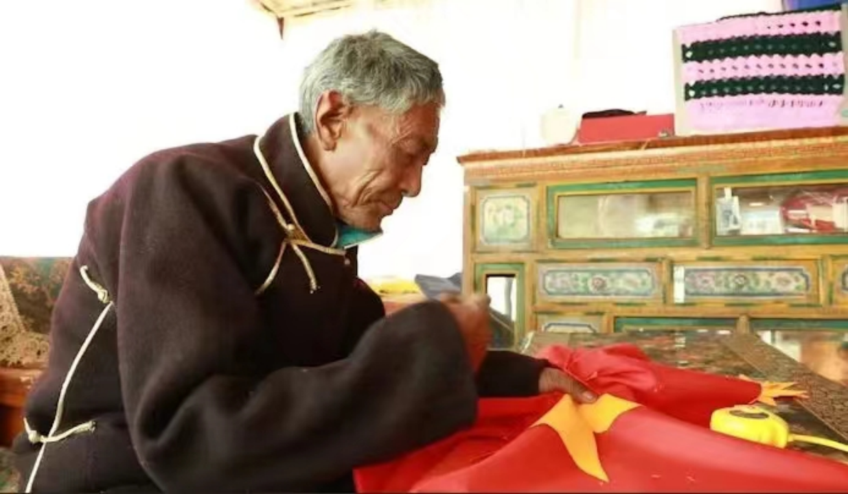 圖為措美縣卓德村堅(jiān)持50年手縫國旗的頓久老人。(受訪者供圖)
