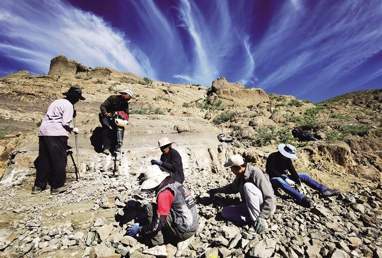 第二次青藏科考期間,中國科學(xué)院西雙版納熱帶植物園研究員蘇濤帶領(lǐng)的“生物與高原隆升協(xié)同演化”專題的科考分隊,從2017年開始在拉孜開展了多次考察研究,在西藏自治區(qū)科考辦和當(dāng)?shù)卮迕竦膮f(xié)助下,最終在柳鄉(xiāng)發(fā)現(xiàn)了化石點并采集少量巖石樣品。