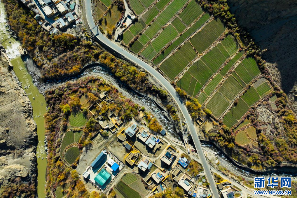 11月16日,西藏隆子縣加玉鄉(xiāng)境內(nèi)拍攝的村莊與農(nóng)田(無人機(jī)照片)。新華網(wǎng) 柑丹鴦琦 攝