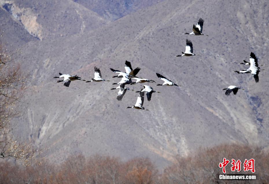 圖為11月21日,西藏日喀則市桑珠孜區(qū)邊雄鄉(xiāng)黑頸鶴振翅高飛。李林 攝
