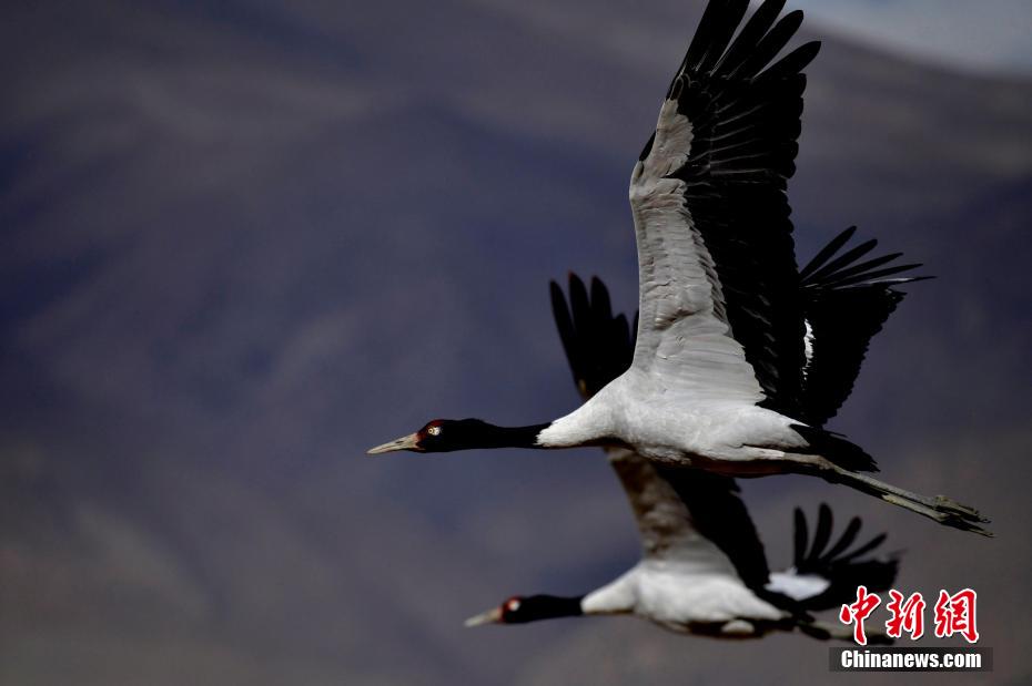 圖為11月21日,西藏日喀則市桑珠孜區(qū)邊雄鄉(xiāng),黑頸鶴振翅高飛。李林 攝