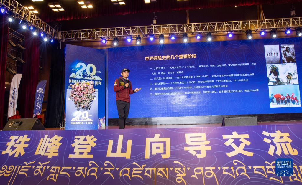 12月11日,原西藏登山隊(duì)登頂世界十四座海拔8000米以上高峰探險隊(duì)隊(duì)員次仁多吉在交流大會上分享自己的珠峰故事。新華社記者 姜帆 攝