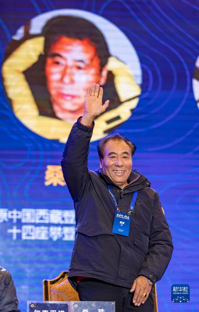 12月11日,原西藏登山隊(duì)登頂世界十四座海拔8000米以上高峰探險隊(duì)隊(duì)長桑珠在交流大會上向觀眾致意。新華社記者 姜帆 攝