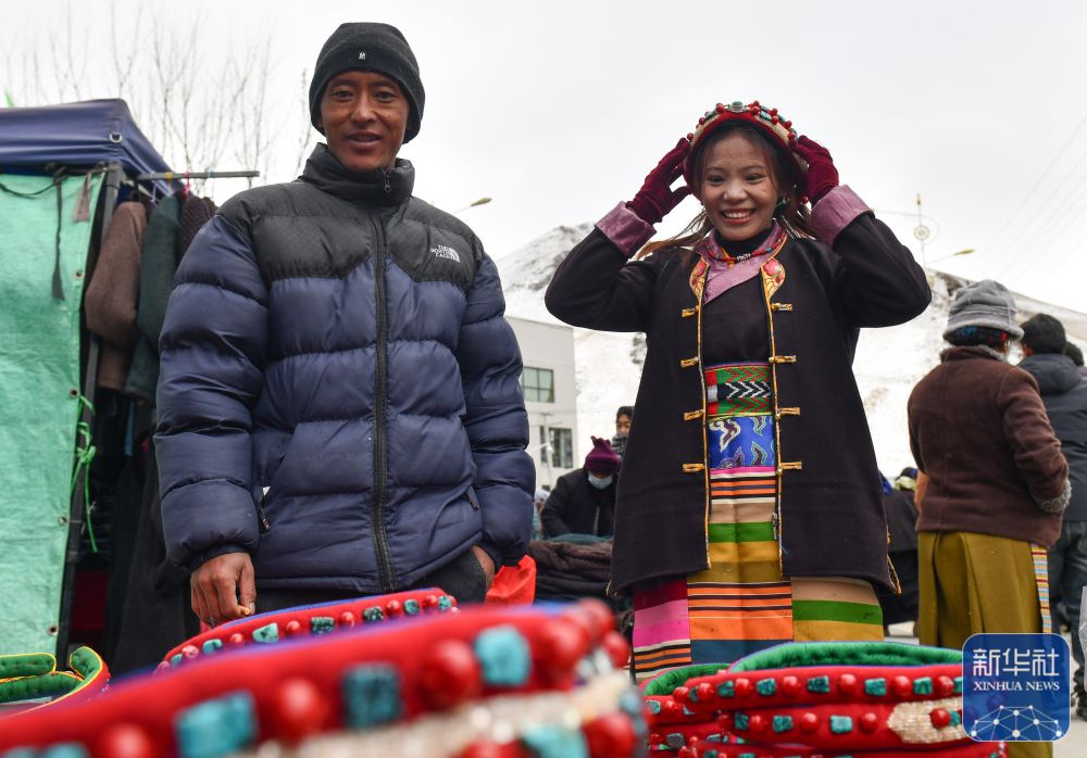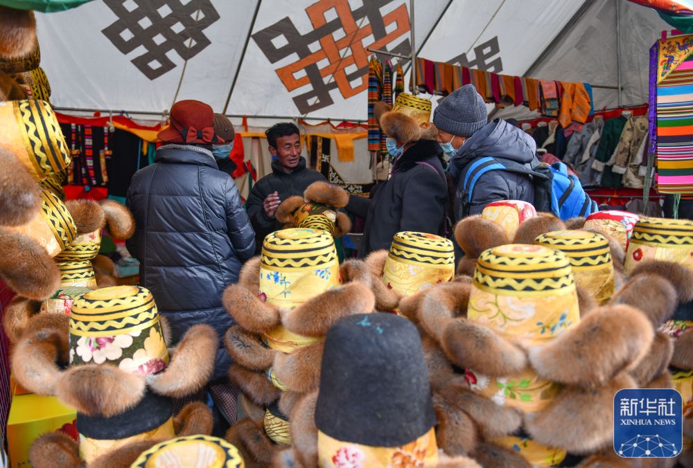 12月13日,西藏日喀則康馬縣冬季物資交流會(huì)上,當(dāng)?shù)厝罕娫谫?gòu)買(mǎi)民族特色帽子。