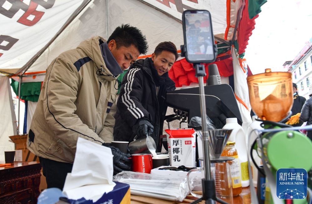 12月13日,西藏日喀則康馬縣冬季物資交流會(huì)上,幾名大學(xué)生在銷(xiāo)售現(xiàn)磨咖啡,并同步進(jìn)行網(wǎng)絡(luò)直播。