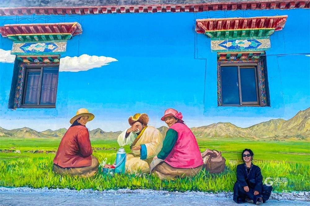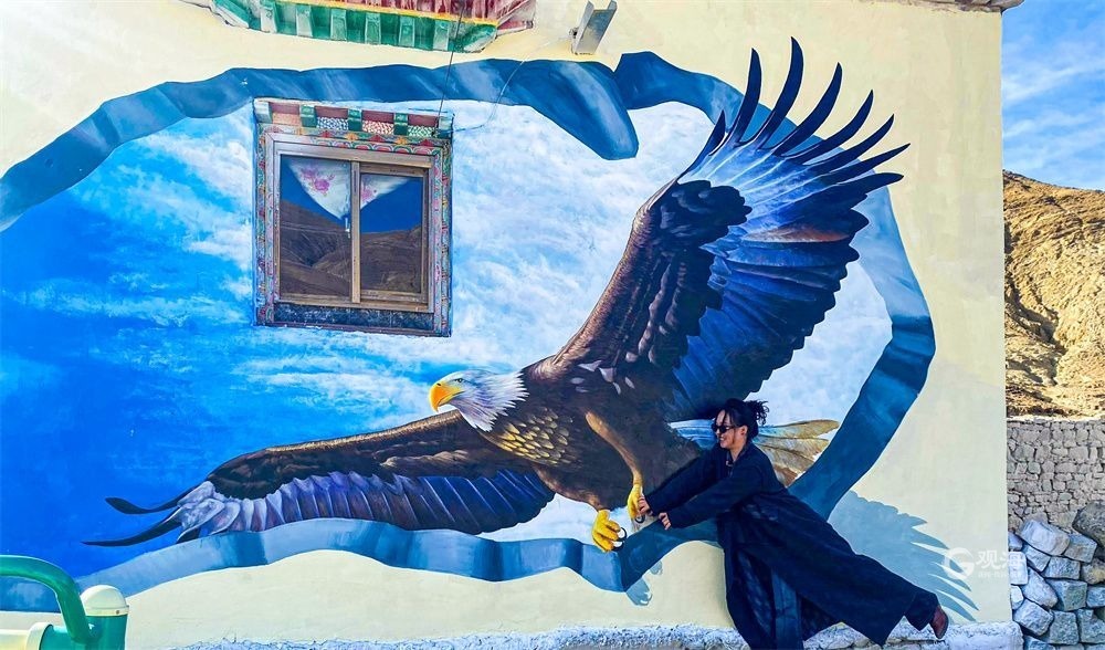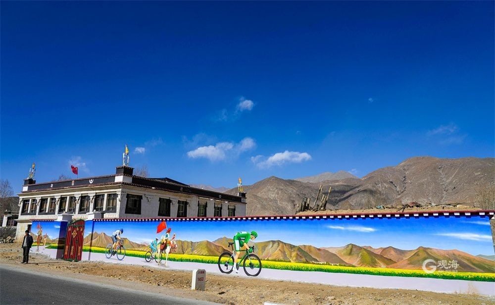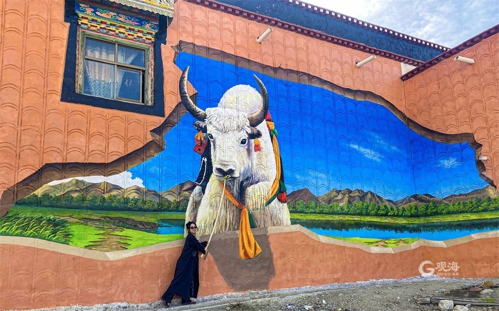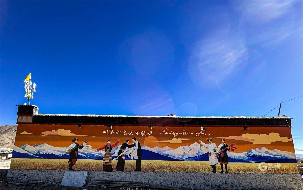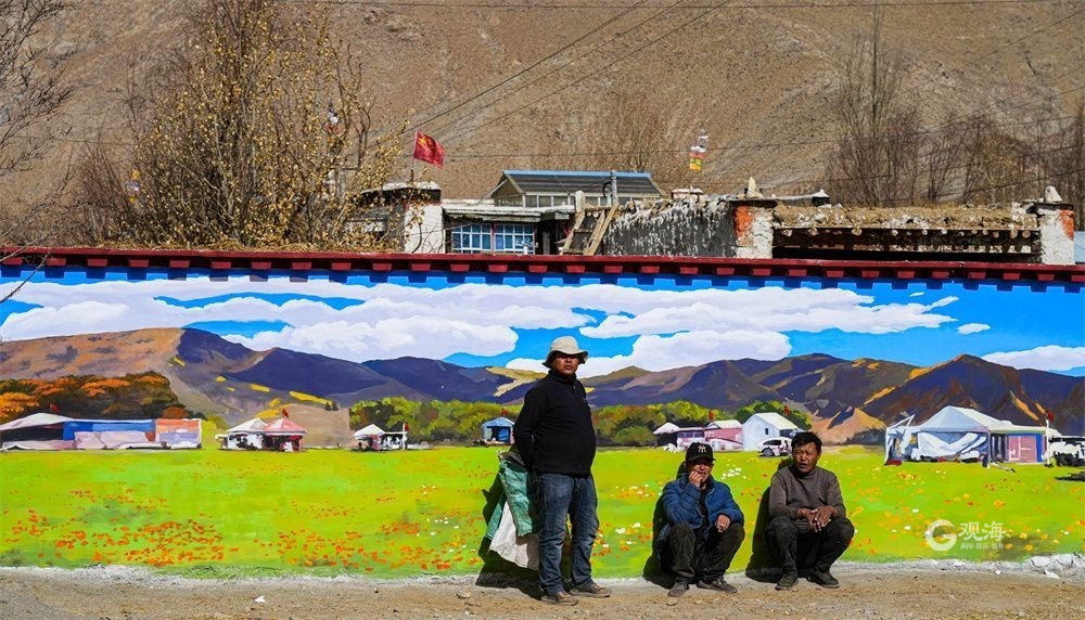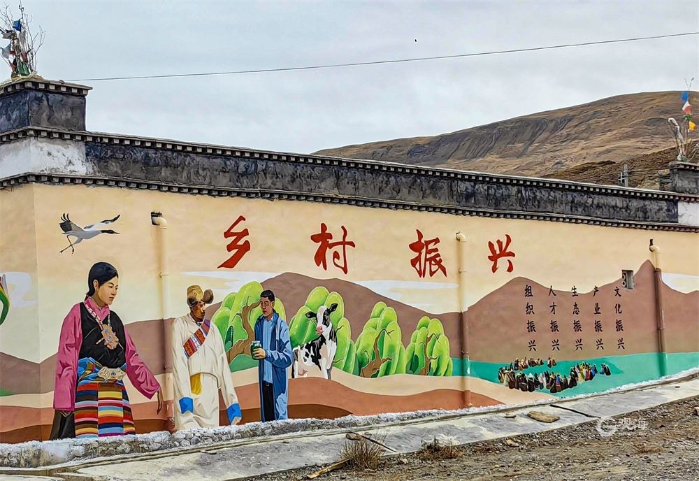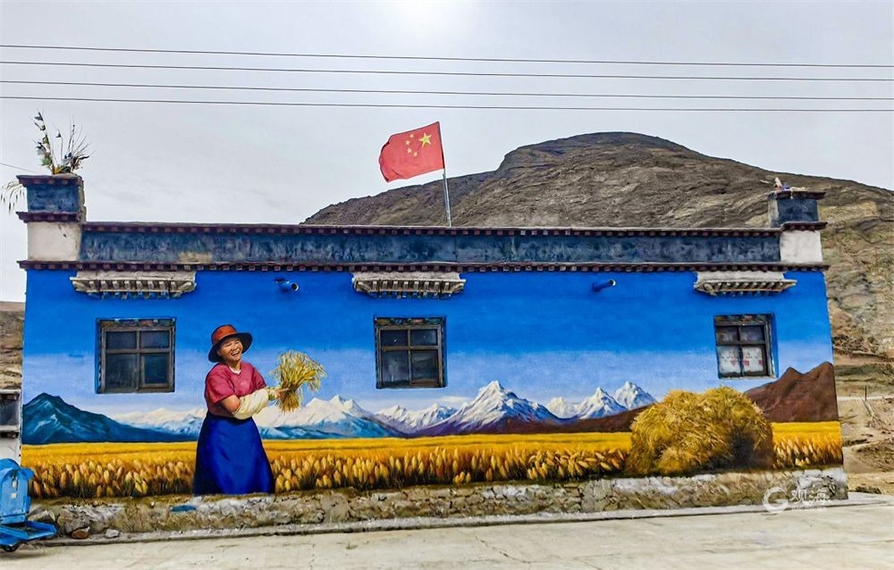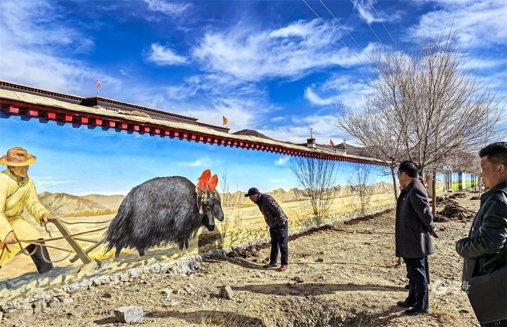 廣袤的高原上,在連綿起伏的山巒之下,是藏族農(nóng)家趕著傳統(tǒng)的“二牛抬杠”耕耘的場景,旁邊的“阿佳”則撒下希望的青稞種子……這樣的場景當(dāng)然不會(huì)出現(xiàn)在現(xiàn)在這個(gè)滴水成冰的季節(jié),而是躍然于藏家傳統(tǒng)村居的院墻之上?!拔壹疫@面墻原來就是貼滿了牛糞,現(xiàn)在畫上了我們平時(shí)勞動(dòng)的景象,感覺比之前更好看了?!鄙V樽螀^(qū)東嘎鄉(xiāng)色定村的村民旦瓊說,此前的一年又一年,他都是把牛糞貼在墻上,固然有傳統(tǒng)的高原美感,但是與現(xiàn)在院墻上畫的鄉(xiāng)村振興的場景相比,還是現(xiàn)在的感覺更不錯(cuò)。