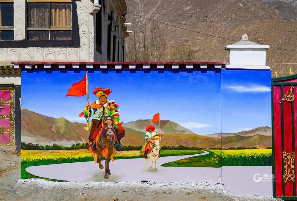 鄉(xiāng)村振興、民族團(tuán)結(jié)、道路安全、移風(fēng)易俗、傳統(tǒng)文化、現(xiàn)代文明、高原特色……各式各樣的場景,現(xiàn)在已經(jīng)出現(xiàn)在了桑珠孜區(qū)東嘎鄉(xiāng)、聶日雄鄉(xiāng)、曲美鄉(xiāng)、納爾鄉(xiāng)部分鄉(xiāng)村的道路兩旁。一幅幅栩栩如生的手繪墻畫,“爬上”了錯(cuò)落有致的藏式小樓,“登上”了一座座藏式院落的院墻,成為一道道亮麗的風(fēng)景線。在干凈整潔的鄉(xiāng)村道路旁,錯(cuò)落有致的農(nóng)家庭院上,粉刷一新的墻面上色彩艷麗的大型墻繪以直觀的畫面和村民喜聞樂見的形式,將鄉(xiāng)村振興、民族團(tuán)結(jié)、移風(fēng)易俗等內(nèi)容與農(nóng)村景觀有機(jī)結(jié)合,讓一堵堵“牛糞墻”有了新活力吸引著過往路人的目光。一幅幅栩栩如生的畫面、一段段民族團(tuán)結(jié)的故事,與鄉(xiāng)村環(huán)境融為一體,形成了“村中有畫、畫中有村”的整體風(fēng)貌;一面面文明和諧、多彩絢麗的彩繪墻,猶如一張張靈動(dòng)的文明標(biāo)簽,將黨的方針政策、藏族同胞的幸福生活活靈活現(xiàn)地展示在墻上,不僅扮靚了鄉(xiāng)村美景,也傳遞了向上向善向美的正能量,處處都能讓人感受到美麗鄉(xiāng)村文明發(fā)展的濃郁氣息。