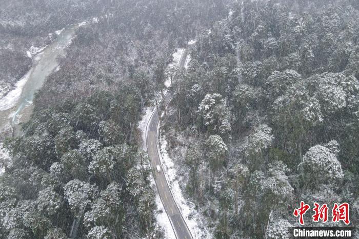 12月18日,西藏墨脫扎墨公路,一輛車迎著大雪去往墨脫縣城方向。(無人機(jī)畫面)中新社記者 江飛波 攝