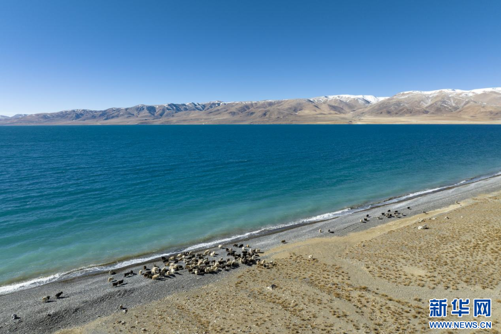 12月20日拍攝的當(dāng)惹雍錯(cuò)湖畔的羊群(無人機(jī)照片)。新華網(wǎng) 旦增努布 攝