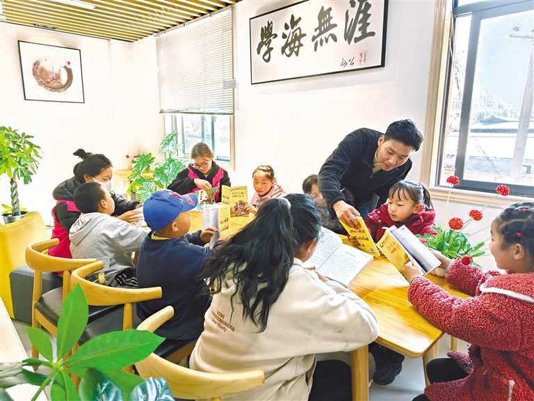 新時代文明實踐志愿服務隊成員在扎拉村農(nóng)家書屋輔導孩子閱讀書籍。謝筱純 王珊 攝