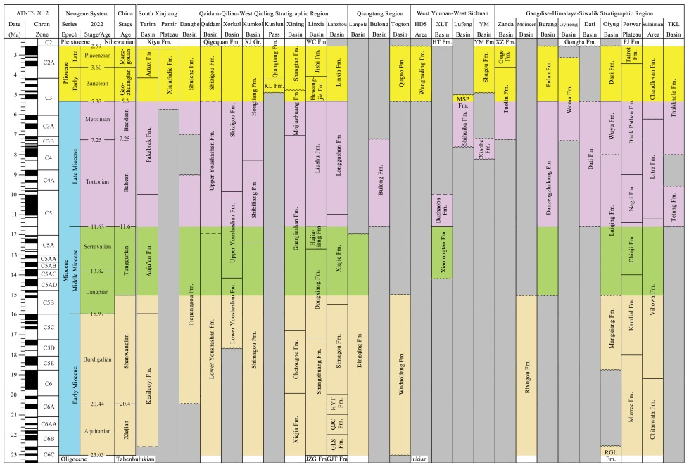 中國的新近紀年代地層系統(tǒng)分為中新統(tǒng)的謝家階、山旺階、通古爾階、灞河階、保德階5個階,以及上新統(tǒng)的高莊階和麻則溝階2個階。研究提出,在青藏高原新生代陸相地層的劃分對比和測年標定上,哺乳動物化石起到非常重要的作用。