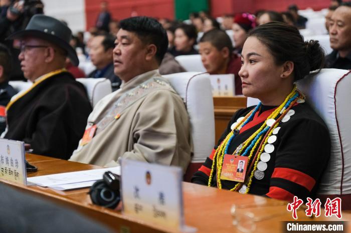 1月9日,西藏少數(shù)民族界政協(xié)委員、墨脫縣達(dá)木珞巴民族鄉(xiāng)鄉(xiāng)長布姆曲珍(右一)在西藏自治區(qū)兩會現(xiàn)場。中新社記者 江飛波 攝