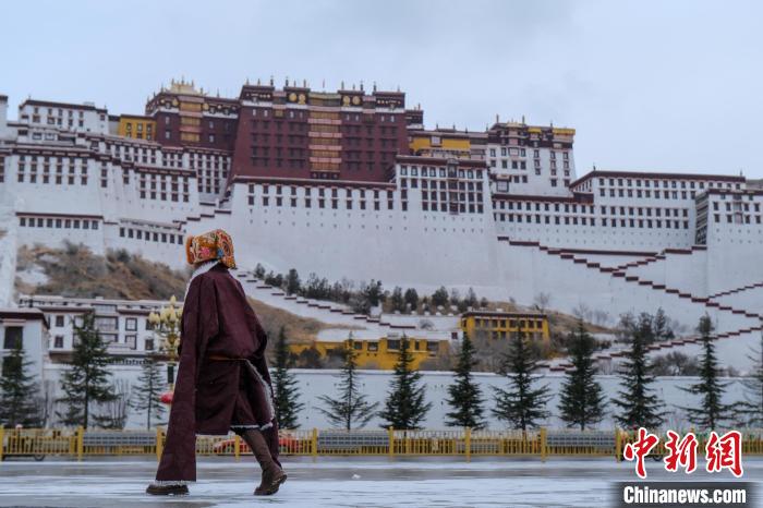 1月16日,西藏拉薩迎來2024年首場(chǎng)降雪,圖為民眾途經(jīng)雪后的布達(dá)拉宮廣場(chǎng)。江飛波 攝