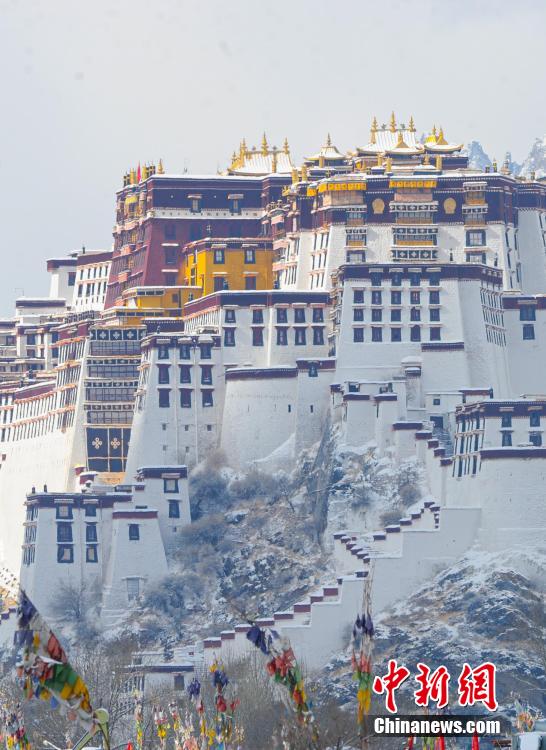 1月18日,西藏拉薩迎來一場大雪,雪后信眾在八廓街轉(zhuǎn)經(jīng)出行。布達(dá)拉宮銀裝素裹,分外美麗。圖為雪后信眾轉(zhuǎn)經(jīng)出行。
