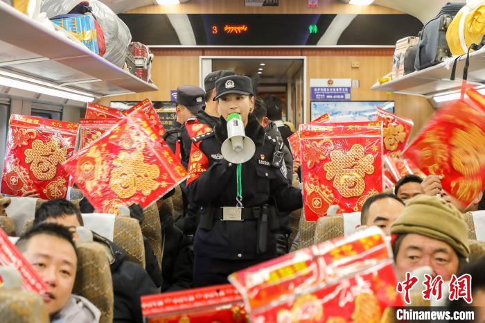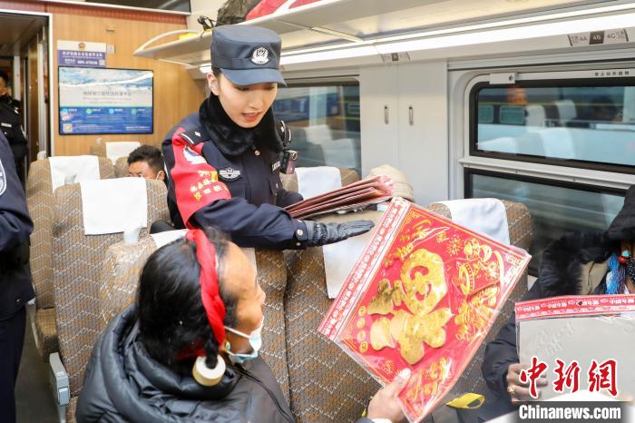 圖為春運(yùn)首日,在拉薩發(fā)往日喀則的C921次列車(chē)上,乘警向旅客送上新春的祝福。黃飛 攝