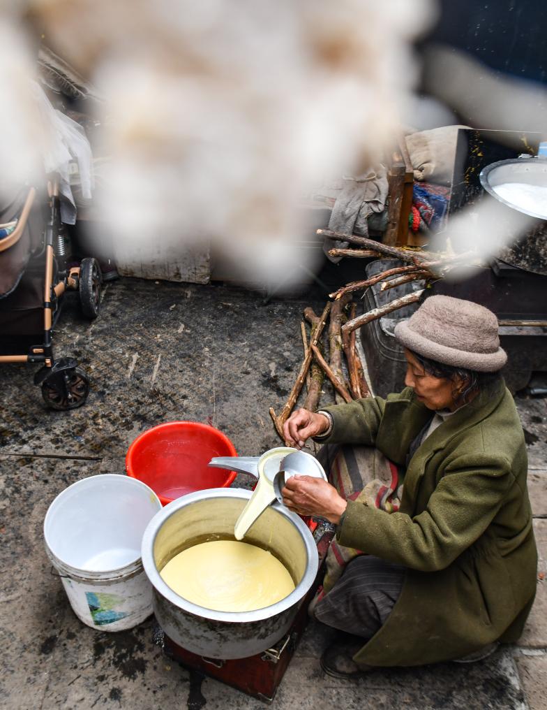 我甚至覺得,我們的到來,對于白瑪?shù)录驄D來說,打亂了他們的生活節(jié)奏。每次我將鏡頭對準(zhǔn)白瑪?shù)录臅r(shí)候,她總會微微一笑,甚至有些不好意思再忙碌下去。每到這個(gè)時(shí)候,我總要說上幾句:“沒事兒,您忙您的,不用管我?!彼麄儾趴辖又墒诸^上的活兒。對于平靜地生活在山村里的這對夫婦來說,教會他們自然地面對我的鏡頭,似乎是一件很艱巨的任務(wù)。