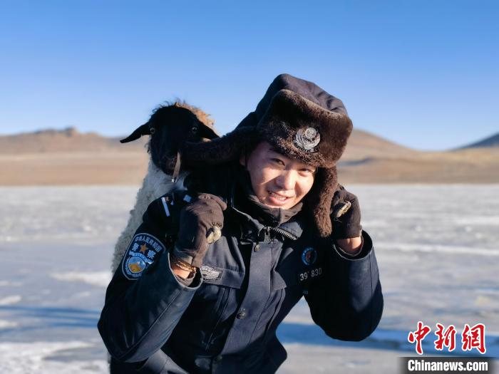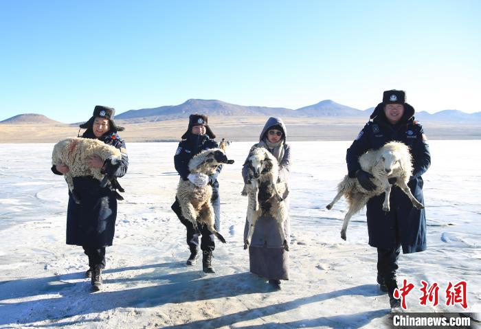 在光滑的冰面上,不時有小羊摔倒,甚至有“懶惰”的大羊直接“趴窩”不前,民警們不是將他們抱著就是扶著前行。在海拔5070米的冰面上負重前行,民警大口喘著粗氣,還時不時踩滑摔跤,但臉上始終洋溢著幸福的笑容。