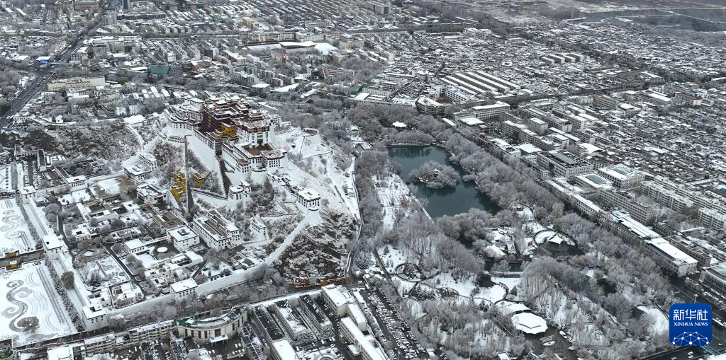 2023年12月8日,雪后的布達(dá)拉宮及其后的“宗角祿康”龍王潭公園(無人機(jī)照片)。新華社記者 洛卓嘉措 攝